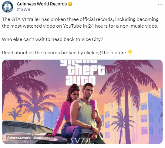 吉尼斯官方宣布,《GTA6》首支预告打破三项世界纪录,分别为YouTube上24小时内观看次数最多的游戏视频、YouTube上获赞最多的游戏预告片、YouTube上24小时内观看次数最多的非音乐视频。