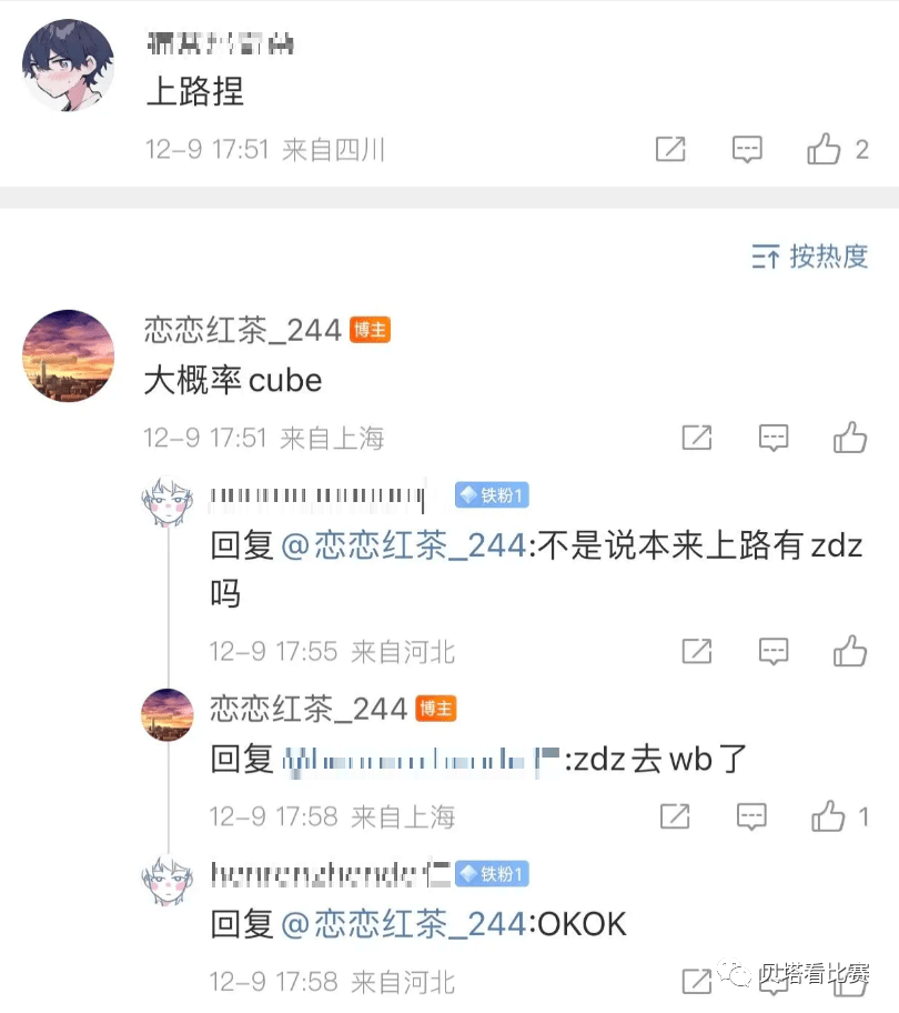 同时另一位爆料人恋恋红茶也在微博透露了类似的消息,有粉丝询问恋恋红茶,OMG的上单是谁,恋恋红茶回应大概率是cube,之后粉丝追问:不是说是ZDZ吗?恋恋红茶表示:ZDZ去WBG了。