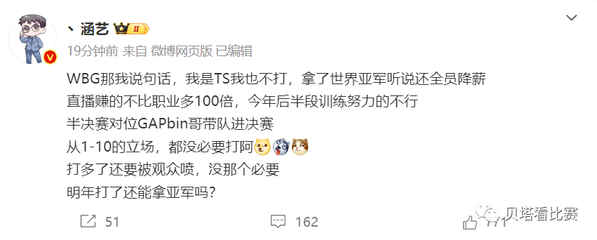 涵艺这段话虽然没有直接说theshy不打了,但是字里行间都在暗示,因为WBG降薪,而且自己舆论环境没有那么好,明年也不能确定再拿到这么好的成绩,所以选择不打了。