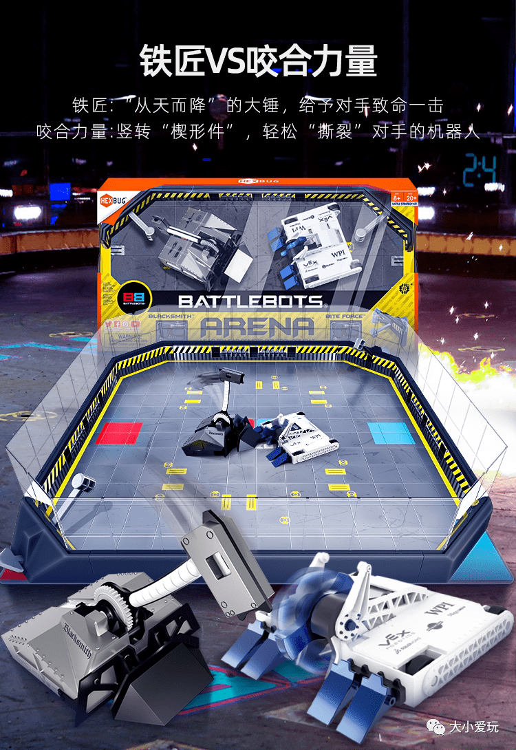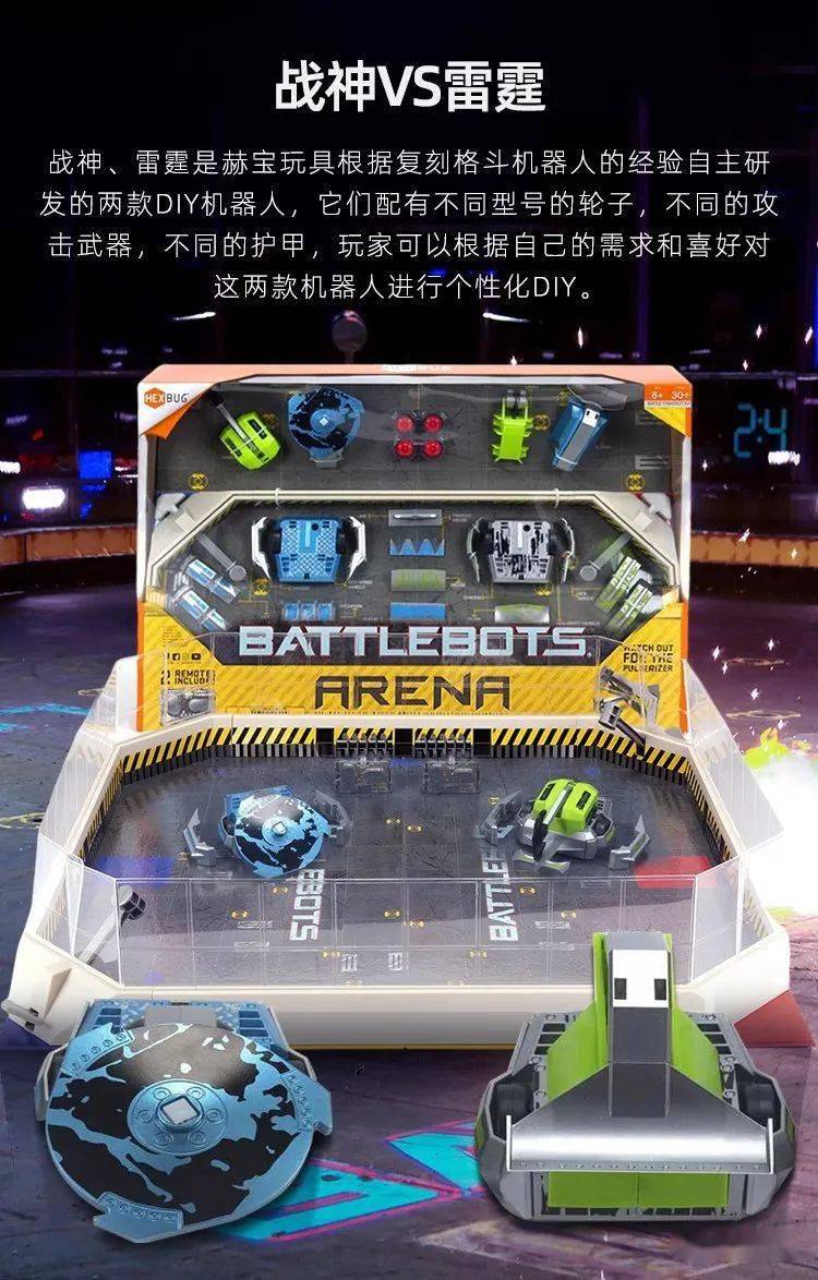 战神VS雷霆竞技场专业版套装包含可进行DIY的战神和雷霆机器人,以及两个遥控器,还有一套完整的高仿真缩小比例版格斗赛场。格斗赛场两个角落也有实力强劲的可操纵大锤,将对方机器人逼近场地的死角一击KO吧。