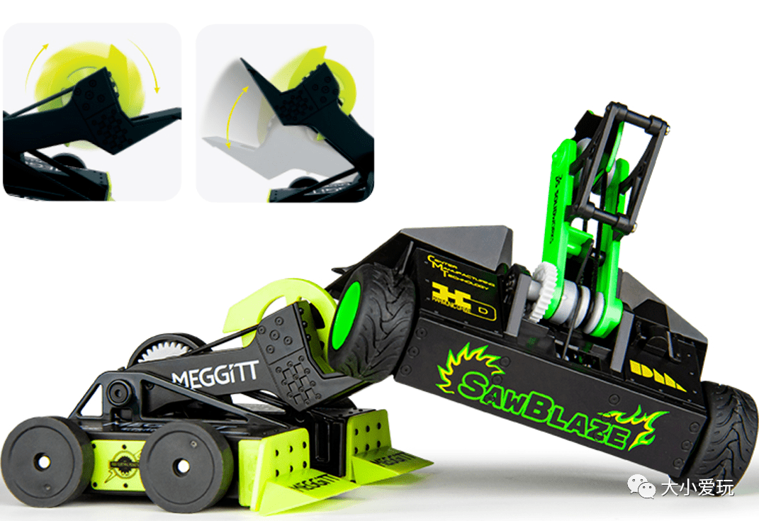 垂直旋转的砂轮通过皮带传动,将主机内部的旋转力传递到武器上,配合武器上的咬合齿,实现攻防一体的效果。