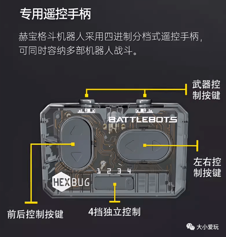 它可以一对一对的进行机器人对战,最多还能支持四个不同的机器人同时开战,这个遥控器上按键功能也很简单,按一下就前进,按两下就后退,左边按一下就左转,右边按一下就右转,再按最后一个就攻击。