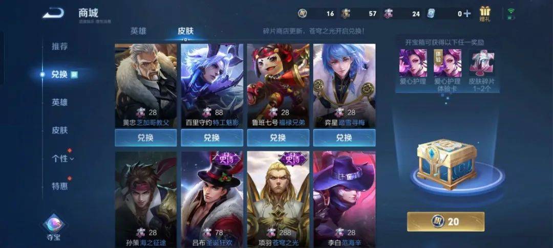 其实,皮肤商店上新已经是每年必不可少的传统了。很多玩家表示期待,但其实能够加入碎片商店的皮肤,早已是烂大街的皮肤了。已经是之前通过各种活动可以获取到的史诗皮肤了。所以,对于老玩家而言,上新的结果,可能是一款早已拥有的皮肤。具体的人选,大概会从孙策和大乔的猫狗日记、铠曙光守护者、百里守约特工魅影、伽罗箭羽风息这五款皮肤之中产出,另外可能还有诸葛亮的黄金分割率,但是这款可能性比较小。