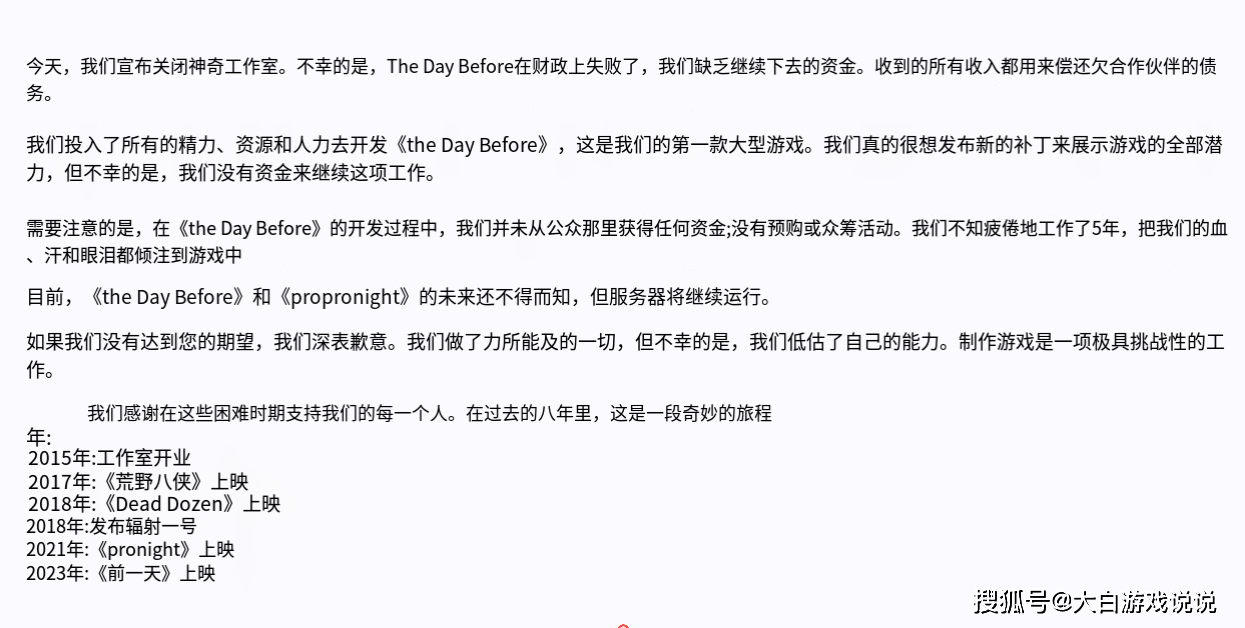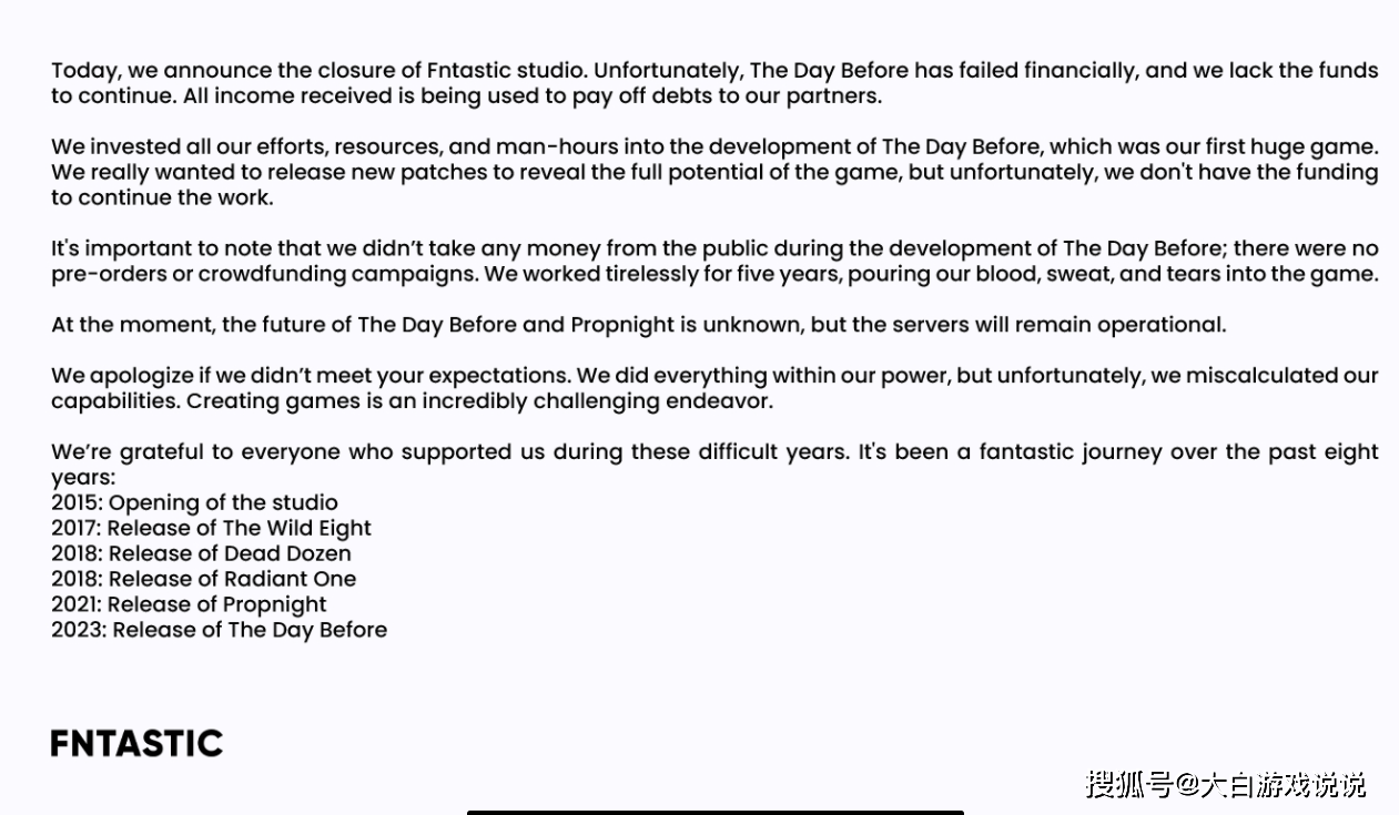 今日凌晨时分,《浩劫前夕》开发商Fntastic发布公告,宣布了工作室倒闭的消息。Fntastic这则公告的第一句话,就伤透了粉丝的心,直接宣布Fntastic工作室倒闭。Fntastic给出工作室关闭的主要原因,竟然是因为财务处理上德失败,筹集不到继续运营的资金。要知道,这款游戏刚上线没几天,现在STEAM上的评价也接近2W条,销量应该是不错的。这个理由,很难让玩家信服。