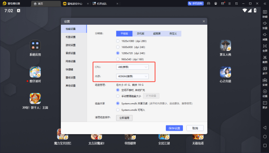 3. 在性能设置-超宽屏中设置超宽屏。然后还可以点下方选择cpu2核,内存2048M保存设置;如果游戏包过大或者游戏画质要求高,可以选择cpu4核,内存4096M,最后保存设置即可。