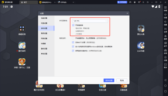2. 在“游戏设置”中选择120FPS并勾选“开启高帧率”。
