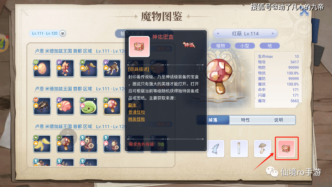 第二个给大家推荐的就是菌菇类的怪物,特点跟第一个草类的植物类似,不会攻击,不会移动,血量也比较低。但是这个比第一个好在一个地方就是,这类植物怪会掉落一个比较稀有的道具:神佑密盒(各种道具,各种装备都可以开到)一个相对于整个游戏很看脸的道具,运气好最直接开出毕业装备也是不成问题的!所以这个也是小编九帝特别推荐的地方!!!