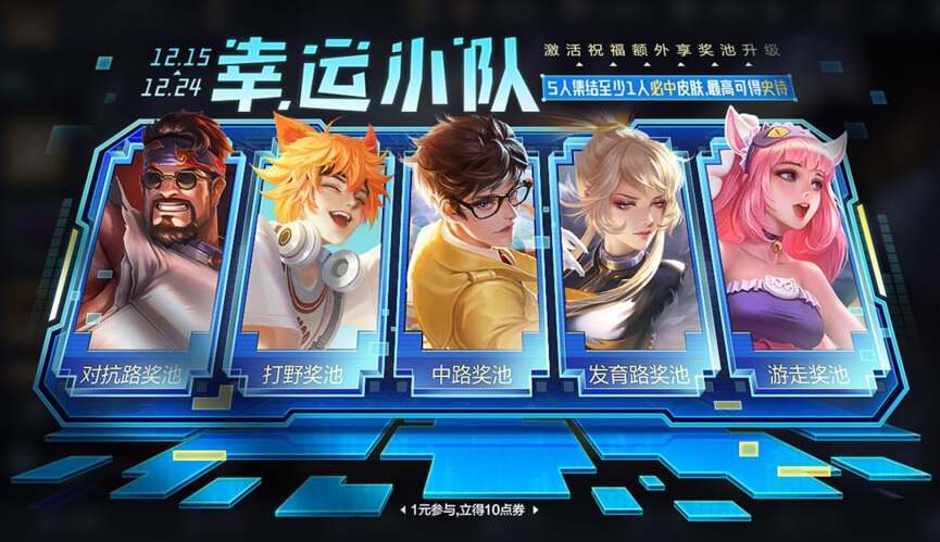 最后就是幸运小队的活动了,在12月15号~12月24号会开启1元活动,5个队友,每人充值1元就可以成功参与活动,这5位英雄其中至少有一位英雄获得永久皮肤,运气好的话,还可以得到史诗皮肤哦。