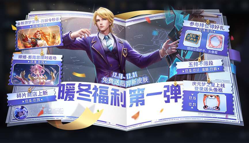 再来就是在12月14日~12月21日这段时间里,参与排位还可以获得好礼,可以获得铭文特效体验卡、花雨缠头像框或者是排位保护卡。其他两样不是特别重要,但是排位保护卡还是挺香的,玩家参与排位就一定要记得领排位保护卡哦。