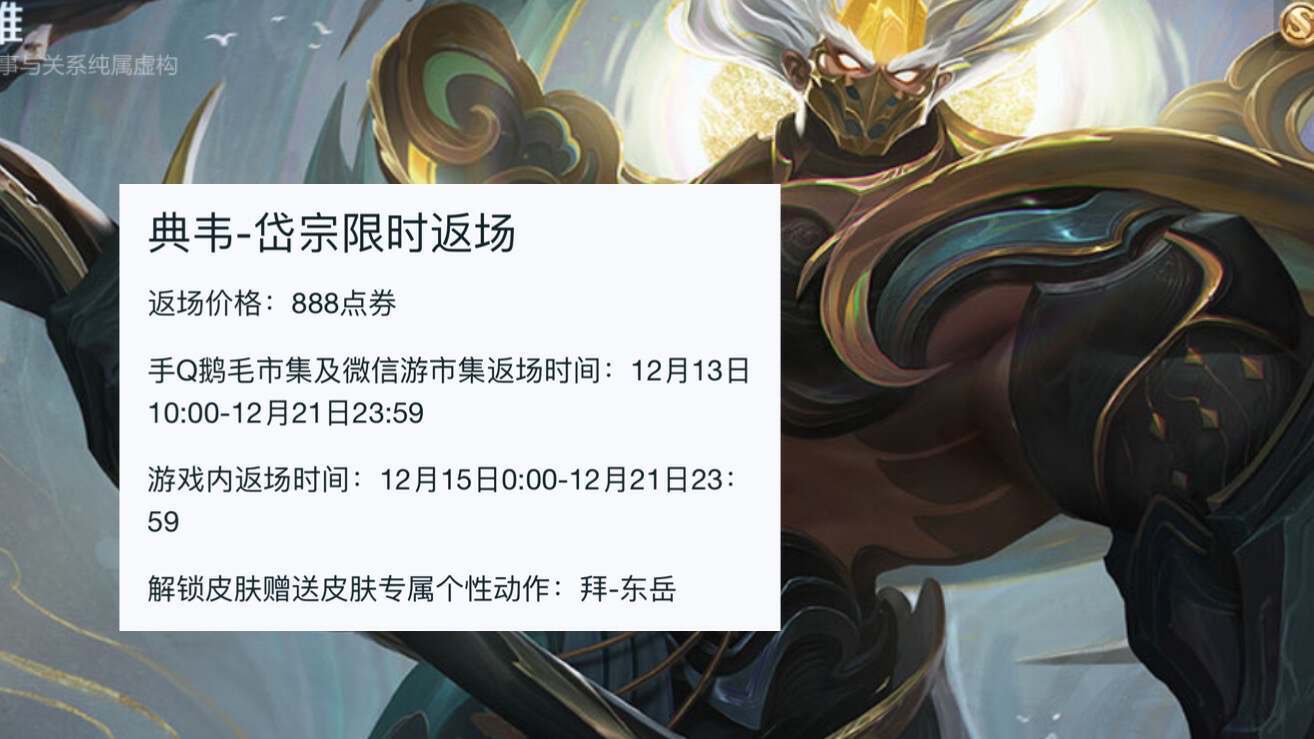另外,在近期典韦的年限皮肤竟然也破天荒的会进行返场。此次返场的价格是888点券,没有贵,是正常价格。这款皮肤在游戏内的返场时间就是12月15日~12月21日。和这款皮肤同时返场的,还有这款皮肤的个性动作,如果入手了这款皮肤的玩家,一定要记得领取这款皮肤的个性动作哦。