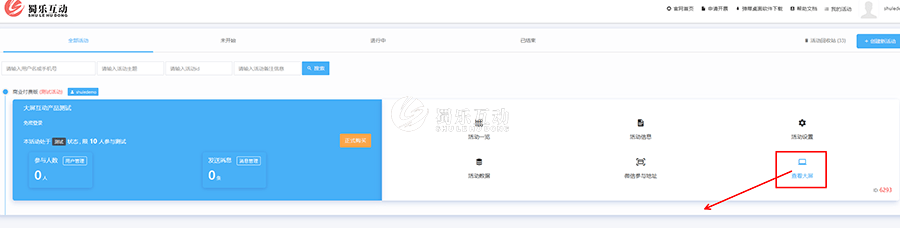 3、创建完成以后,互动游戏类产品默认不需要做任何设置就可以直接使用,可以直接点击活动名称后面的“查看大屏”进入大屏幕页面。