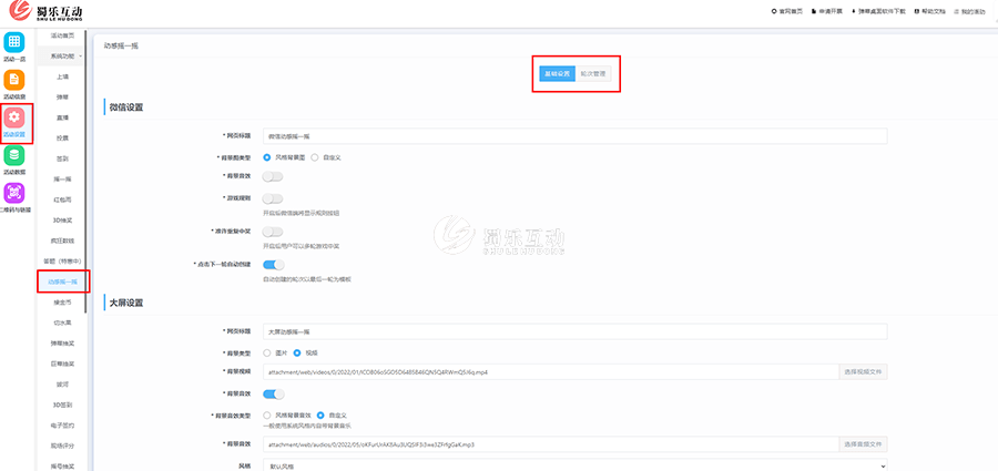 7、蜀乐互动平台上的互动游戏类产品设置模式和流程上都是一样的,这里以“动感摇一摇”产品设置为例进行说明。设置都分为两个部分“基础设置”和“轮次管理”: