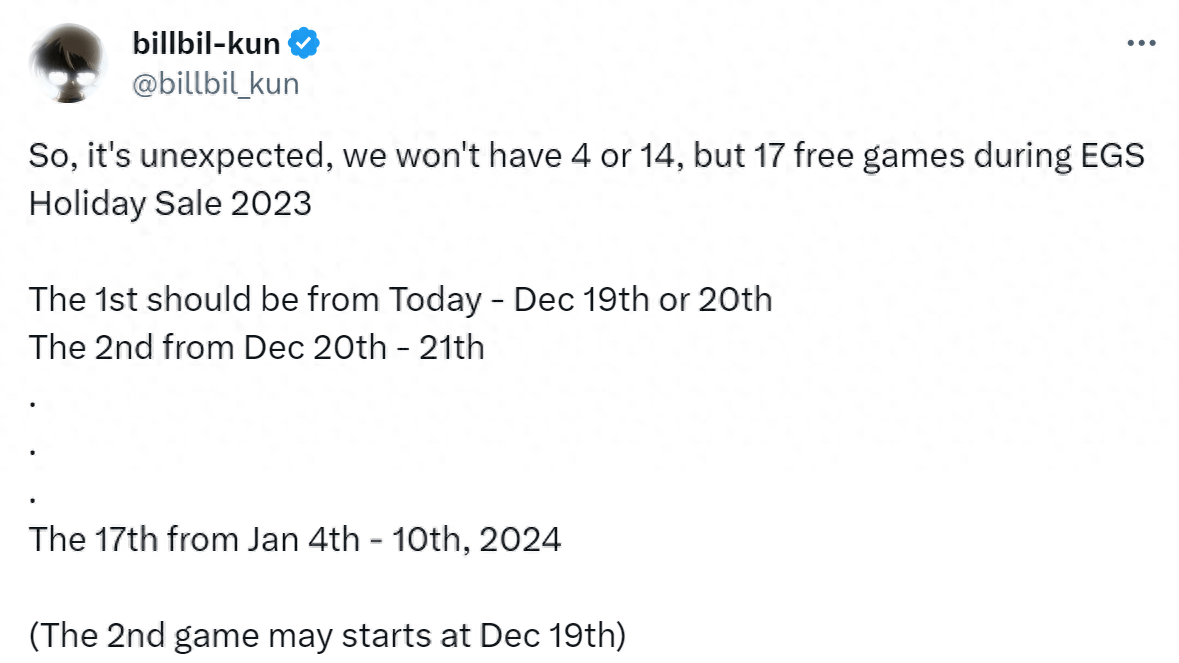 据业界著名大佬billbil-kun爆料,Epic将在圣诞假期期间送出17款免费游戏,首款游戏可能在12月19日或20日送出。