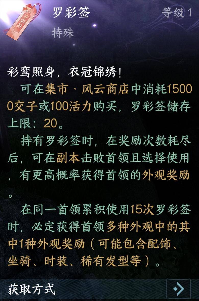 现在不只日常本江湖风雨事,在使用全新加入的道具“罗彩签”后,游戏中所有副本掉落的稀有外观,都会在玩家通关一定次数后100%掉落!