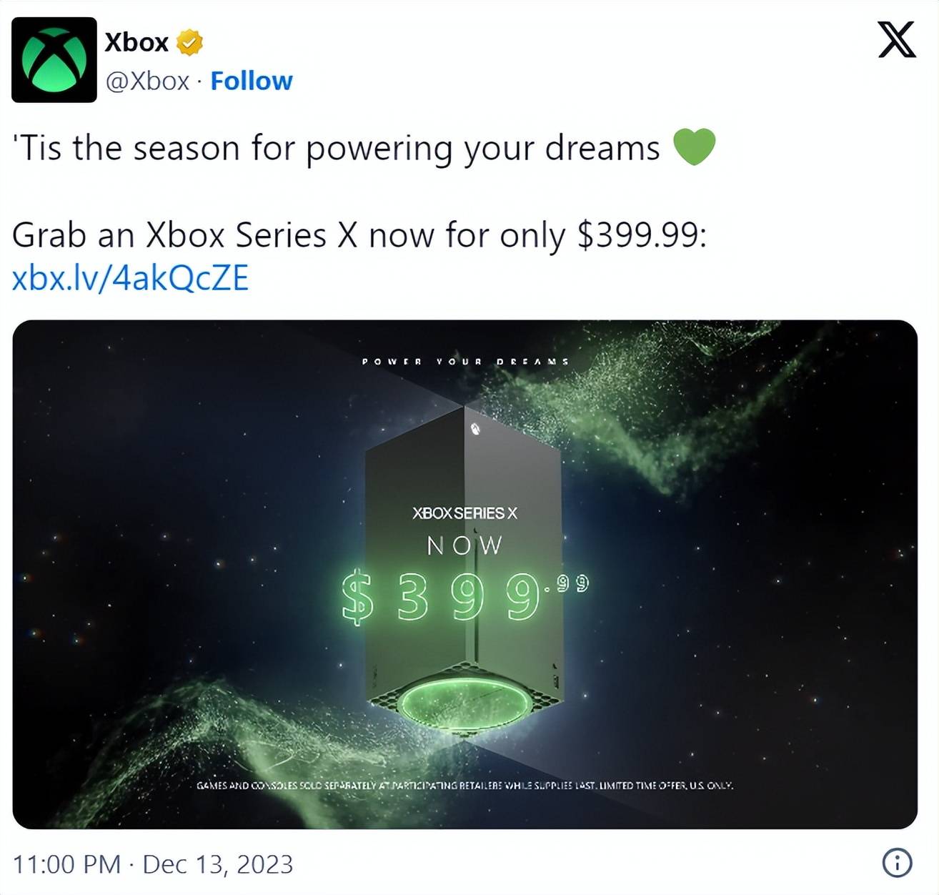 另一方面,随着圣诞节的临近,微软次世代主机Xbox Series X官方售价在12月13日从500美元下调至400美元,降价幅度达到100美元(约合人民币713元)。美国的亚马逊、百思买、沃尔玛、GameStop、微软官网都已更新价格。Xbox Series X支持4K和120 fps,暗黑4也在其上发售,有兴趣的可以考虑下。
