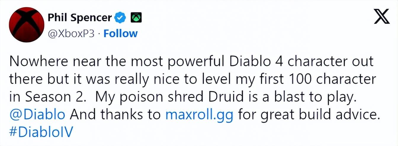 微软Xbox部门老大菲尔·斯宾塞最近在社交媒体晒图,炫耀自己在暗黑4的德鲁伊角色已经练到满级(100级)。