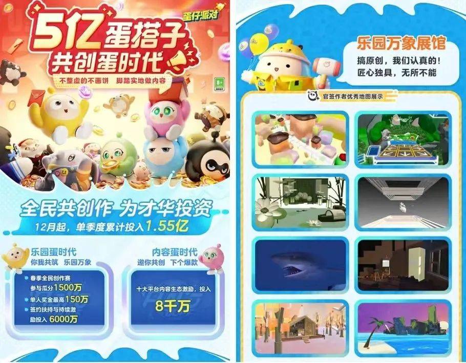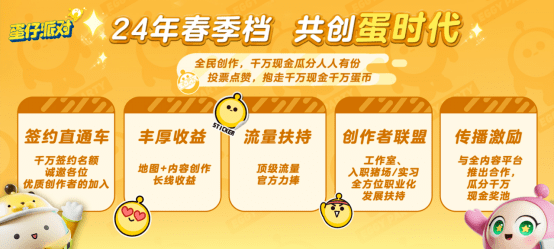 另一方面结合多元创作赛事打开工具更丰富的应用场景,以提升创作技能的形式获取丰厚的现金回报,并在「激励+签约体系」的支撑下,持续接收长线收益,并从官方签约通道中实现更多个人价值的落地。在此基础上,《蛋仔派对》2024年初的全民春季创作赛,从全民普惠的角度,以单次1500w奖金与千万蛋币的加码力度开拓更高的价值层级。