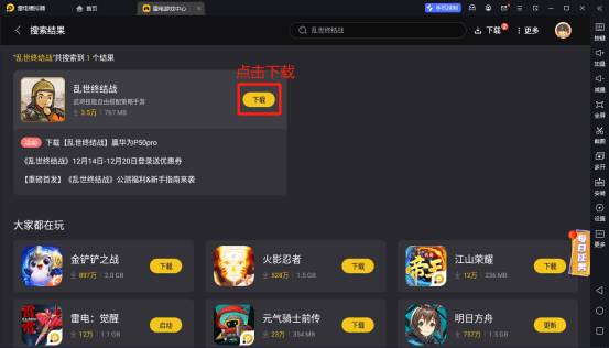 等待下载安装完毕后,在首页搜索栏中搜索“乱世终结战”,直接点击下载即可。