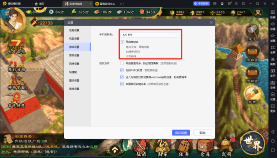 2. 点击左侧的游戏设置,可以根据电脑配置或个人需要选择120、144、165FPS,设置完参数记得保存哦!最后重启模拟器打开游戏即可设置成功。