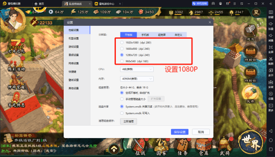 1. 在设置-性能设置中调整画面清晰度,根据设备性能将画质拉满,这样可以随时在乱世终结战电脑版中享受到紧张刺激的即时战斗。