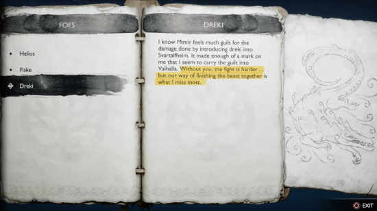 近期,在游戏中出现了一个令人动容的细节,虽然主角阿特柔斯已经不在场,但奎托斯依然时刻表现出对儿子的思念之情。在奎托斯留下的多份笔记中,他将阿特柔斯称为“你”,就好像正在与他的儿子对话一样。这些零散的内容通常出现在与主旨和阿特柔斯无关的讨论中。