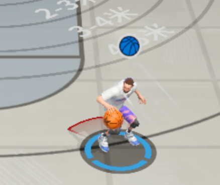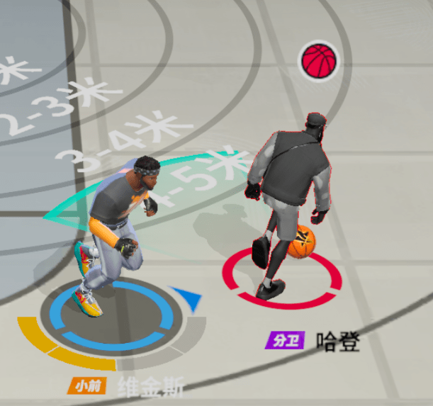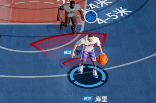 防守高端玩家的库里的首先要选择好站位,这里建议大家踩干扰区的最外围,这样可以有效克制库里的横移。这样即使我们没有加速技能,也可以确保库里的横拉位移始终在我方的干扰区内,这样就能将库里的横拉和撤步三分威胁降到最低。