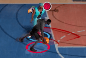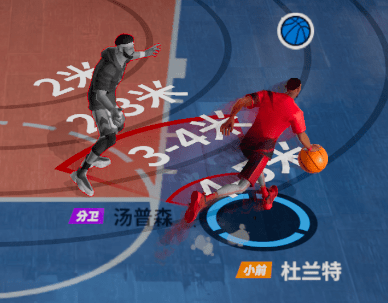 还有一种方式是直接紧贴杜兰特,然后观察的他的突破节奏。对手一般在第一段突破后会拉回,这个时候利用防守技能卡停他的运球。