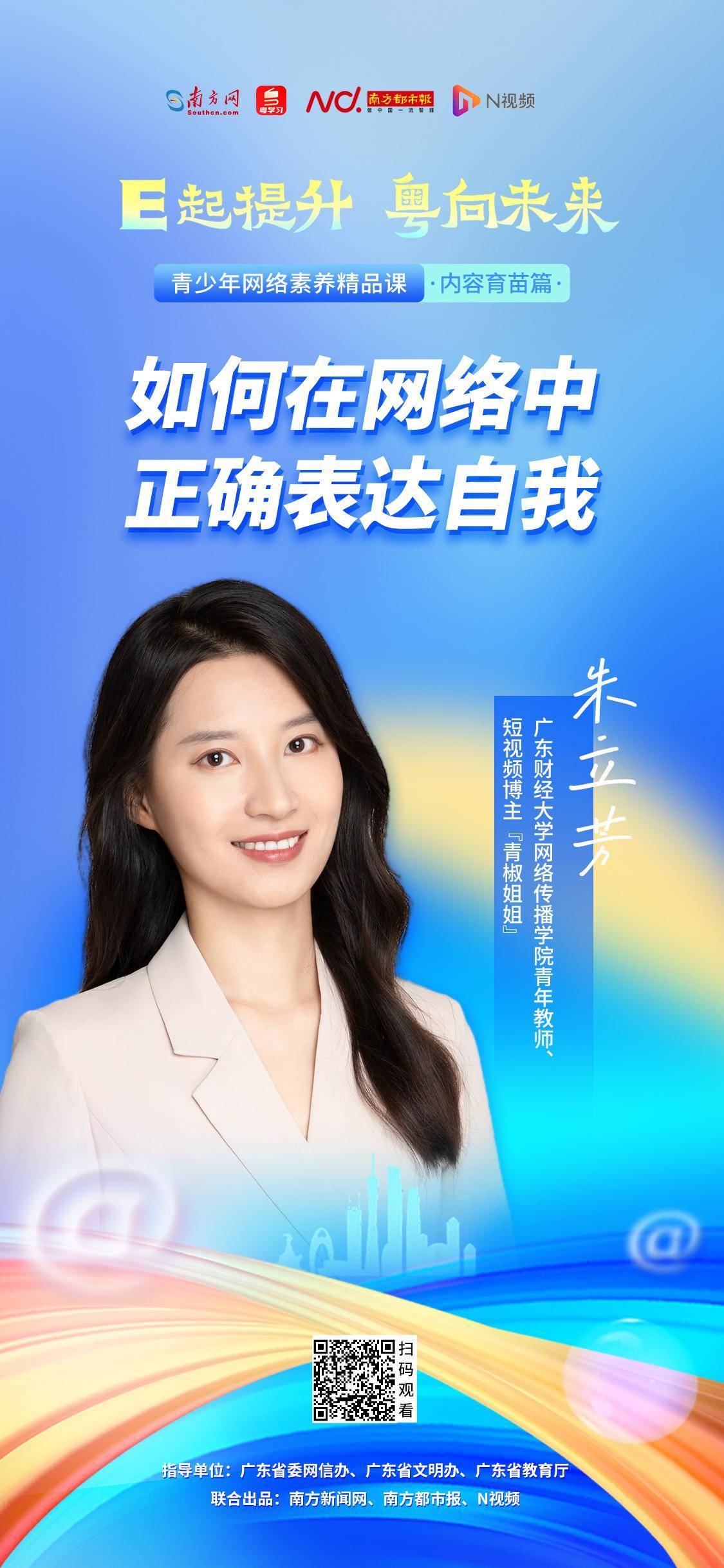 这是广东财经大学网络传播学院青年教师、短视频博主“青椒姐姐”朱立芳在“E起提升 粤向未来”青少年网络素养精品课程第3集《如何在网络中正确表达自我》中讲述的古人高级玩梗。在这个“干货”满满的网络表达小课堂上,朱立芳通过一个个风趣又接地气的例子,教导孩子们控制好娱乐上网的时间,多读书、保持独立思考,不跟风玩黑梗、不当“键盘侠”,正确地利用网络进行表达和思考,用好手中的麦克风。
