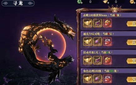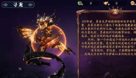 “寻龙”共有“总述”以及三个章节,总述预设了丰富的剧情线描述,方便玩家了解龙装的背景以及剧情内容,而章节则设定为每日解锁一个新的章节。玩家可通过达成指定任务条件完成“寻龙”任务,解锁新的故事文本,推进剧情,并获得大量“龙装”养成的道具奖励。