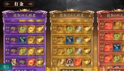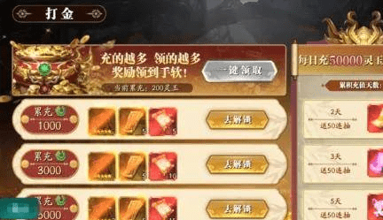 作为最基础的系统,记录了玩家的“打金”收入和显示玩家每日可提取的额度,是能通过消耗打金金额在对应档位进行免费提取游戏内高价值货币“灵玉”的系统。而打金金额获取,就需要玩家使用不同额度的打金红包来实现。
