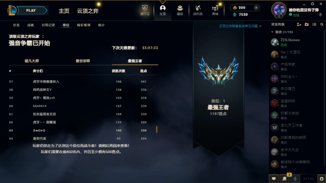 (第一次积分赛天梯榜截止末尾64名为最强王者524胜点)