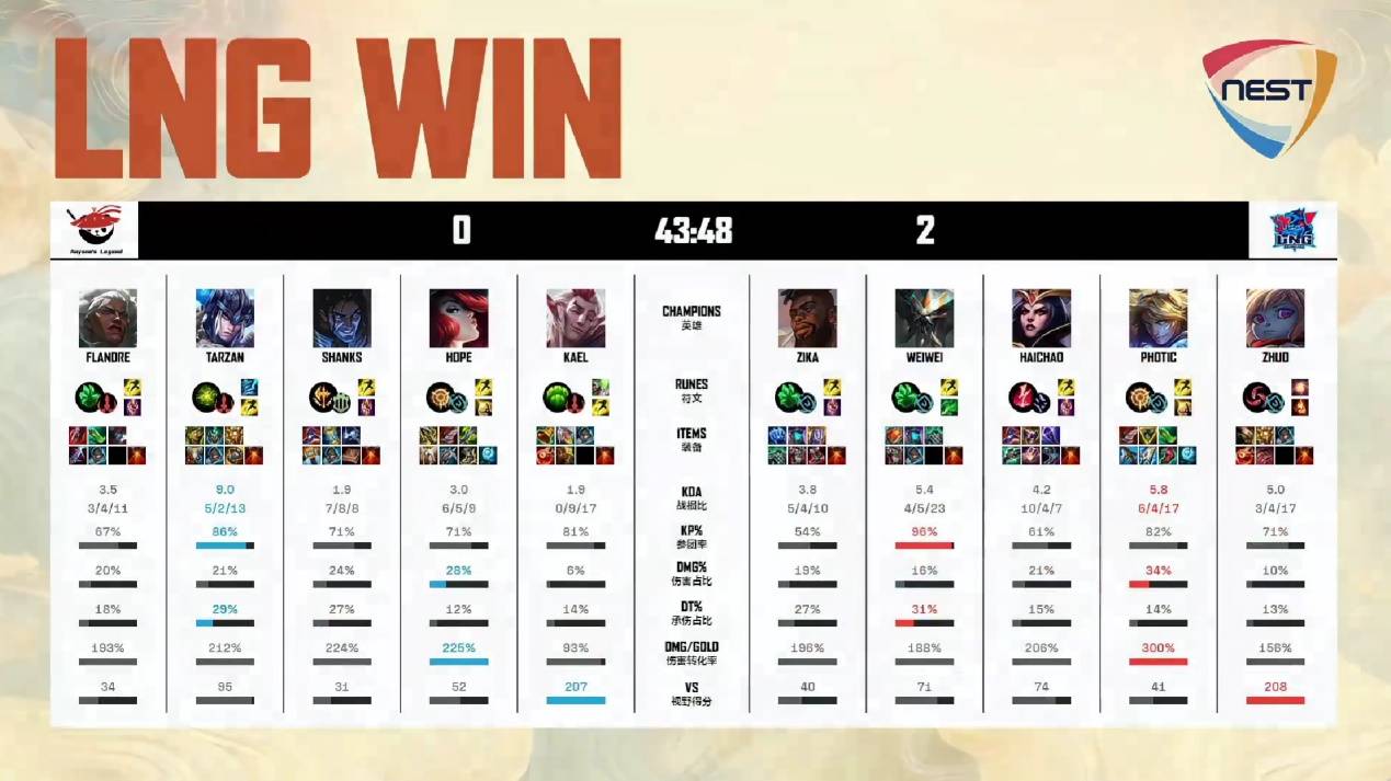 在转会期结束之后很多观众其实都把AL和LNG放在一个水平线上,认为两支战队实力差不多,不知道NEST是否有这方面的考量选择让这两支队伍来打表演赛,结果没想到LNG是直接横扫了对手。