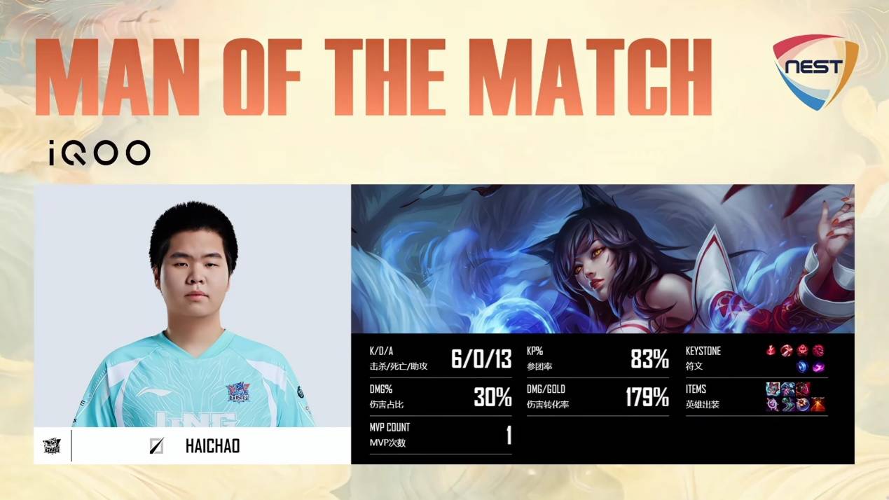 中单Haichao爆发,狐狸全场拿下6-0-13的豪华个人战绩,成为第一局比赛的MVP。