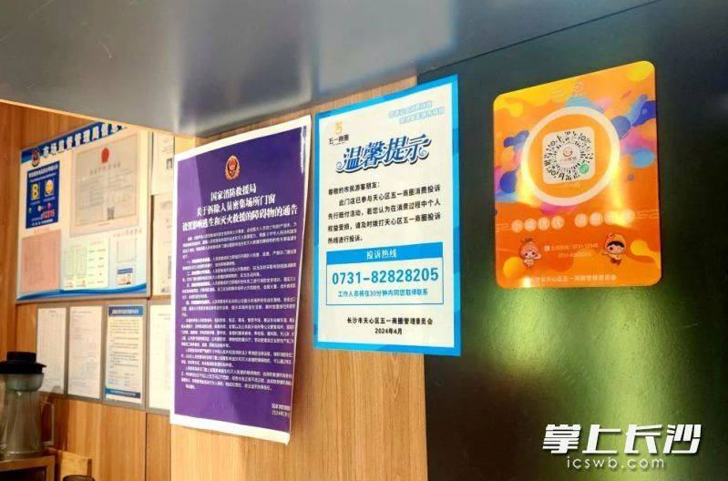 黄兴南路步行街商家门口张贴的温馨提示和“小诚优优”小程序二维码。天心融媒供图