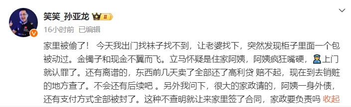 这次是真的物理意义上的偷家,据笑笑动态描述,原本他只是想找袜子,结果却发现柜子里的包被动过,里面的金镯子和现金也不翼而飞。第一时间笑笑就怀疑是住家阿姨,报警以后对方立马全撂了!