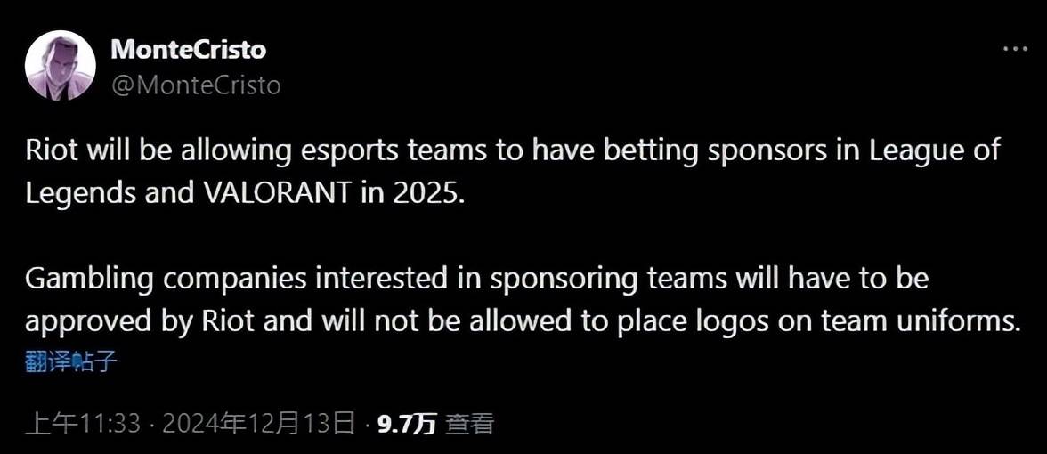 上周,外网爆料者带来了一则关于职业战队运营的重磅消息。据悉,从新赛季开始各个赛区的队伍将被允许接受菠菜公司的赞助。这件事流传很广,并引发了大家的广泛讨论。就在近日,拳头游戏电竞首席运营官Whalen Rozelle,还正式确定了该事件的真实性。