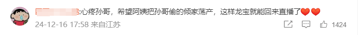 然而在这条微博下的评论区,却一片欢乐之声,以DYS的乐子人居多。一些粉丝在知晓这件事的第一反应就是:“心疼孙哥,希望阿姨把孙哥偷的倾家荡产,这样龙宝就能回来直播了。”