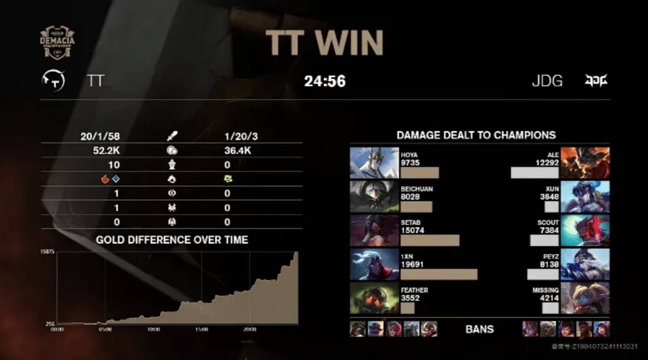 随后TT又策划了一波关键越塔,JDG尝试先手反击,但Missing控制加里奥反而送掉了自己的人头,后续TT发动二次越塔进攻,JDG直接被打出0换3。