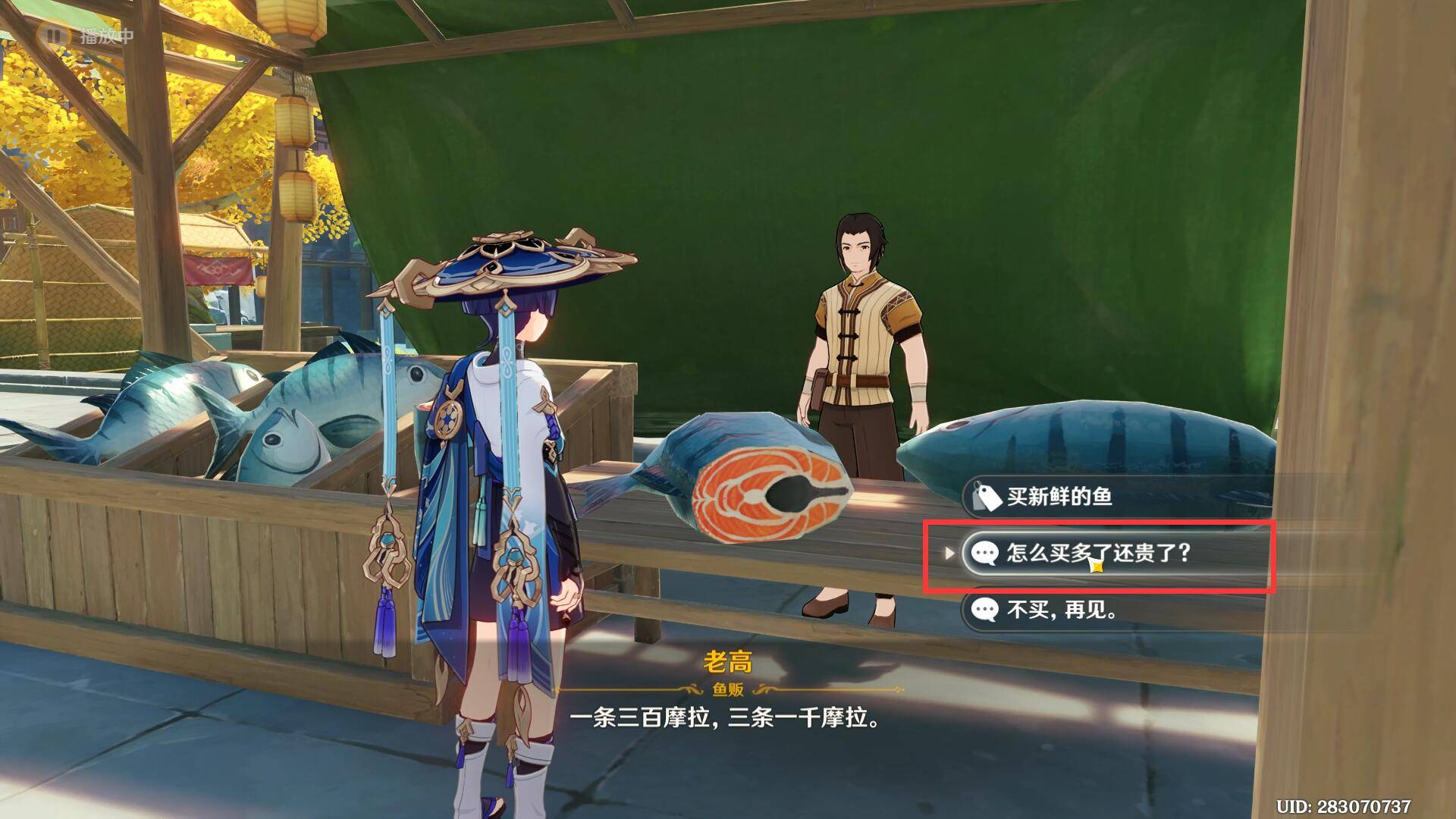 故事要来到璃月港的码头这边,我们可以看到一个叫老高的鱼贩,当我们玩家跟他聊天时,他的态度就是一脸的嚣张跋扈,并且,点开他的商店,准备购买东西时,我们会发现,他卖的东西,那叫一个贵,两个鱼肉,结果,人家居然卖1000摩拉和300摩拉,相当于现实中花100多半块鱼,都快把奸商写在脸上了。