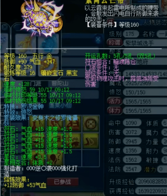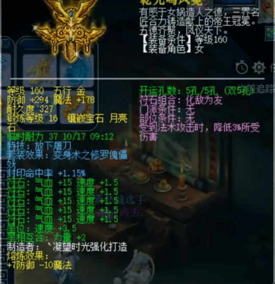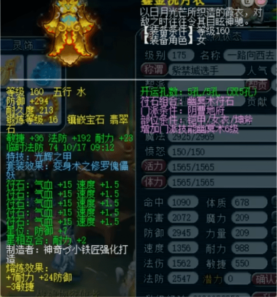 160级16锻女衣,熔炼后防御318、耐敏双加63