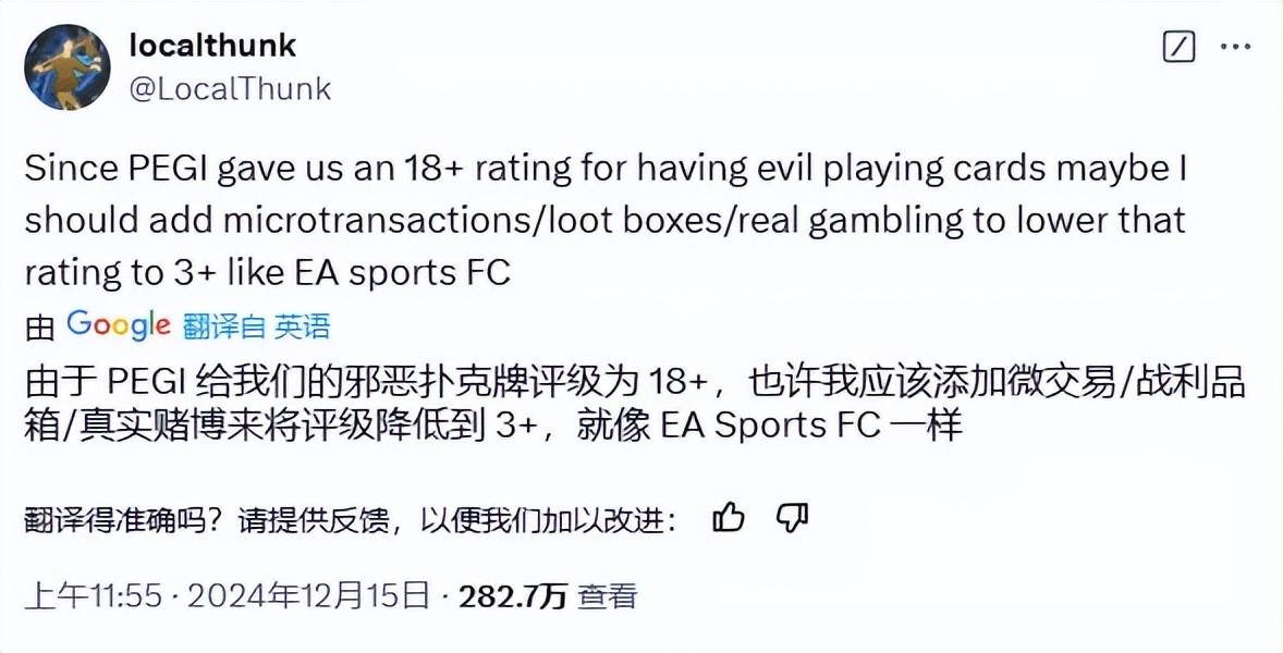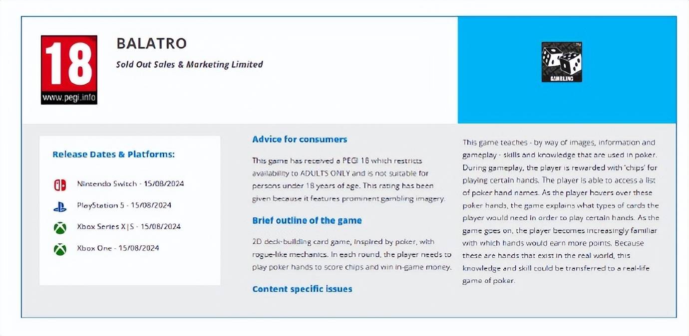 最近Localthunk就对审查机构给《小丑牌》贴上18+的标签感到恼怒,理由则是因为游戏中包含扑克牌的元素。反倒是一些带有微交易、开箱机制的游戏,被评为3+游戏。(允许3岁以上玩家游玩体验)
