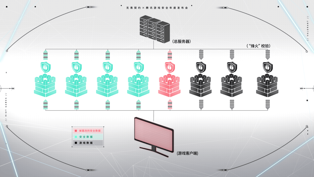 这是因为《无畏契约》引入了名为“烽火架构”的数据传输框架。从游戏登录到登出,该系统会将安全数据混于游戏数据中。这些“烽火”在数据上传、下载的过程中,会不间断地进行多链路校验。只要检测到任何一条链路传输数据出错,安全团队便会立即采取行动。