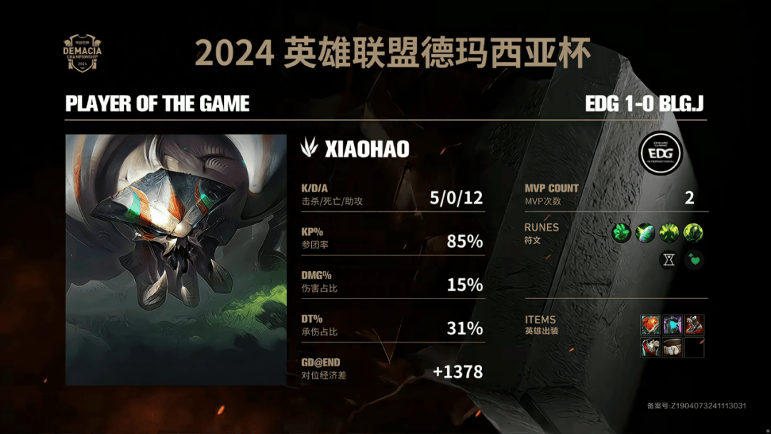 本场比赛,由EDG英雄联盟分部取得胜利,MVP给到Xiaohao选手!