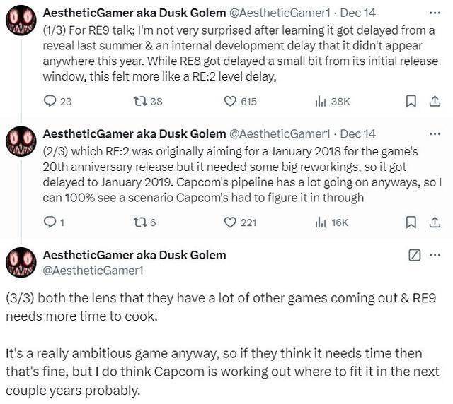 最近爆料人Dusk Golem发推文称,《生化危机9》原本应该在2023年夏天宣布的,但因为内部开发延迟而被推迟。这是一款雄心勃勃的游戏,与之前的几款《生化危机》重制版相比,其需要更多时间来完善。