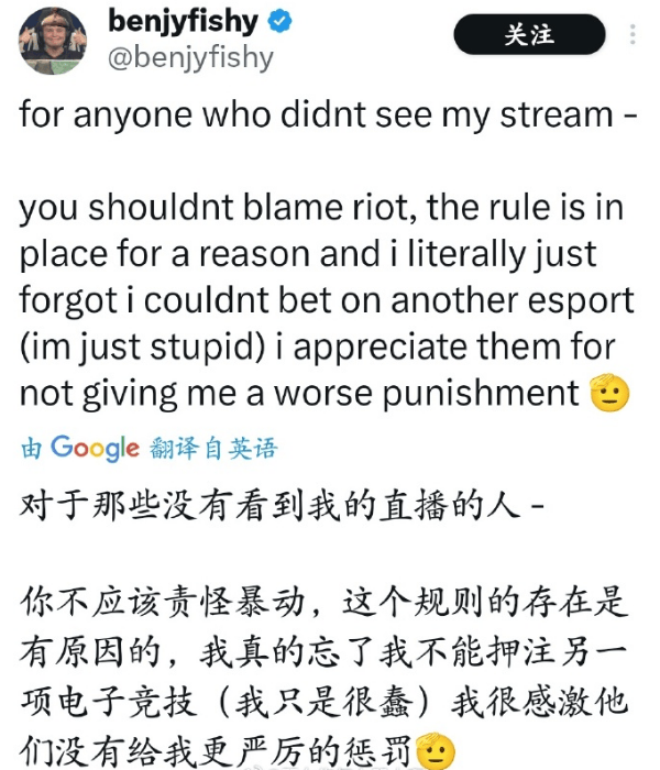 其本人后续在直播中和社交媒体上还回应了这件事,并表示自己把不能投注这条规则给忘了,临了还感谢拳头没有给太重的惩罚。值得一提的是,Benjyfishy在这次投注中还赢了100欧元。