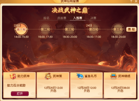 本次武神坛明星赛共有四个福利活动,分别为助力武神、武神坛、鲨鱼礼币和武神锦绣。不过,目前只开启了助力武神活动。武神锦绣的开启时间为12月26日8:00,武神策抽卡的开启时间为12月26日12:00,鲨鱼礼币的开启时间为12月29日12:00,对这些活动有需求的小伙伴记得关注一下!