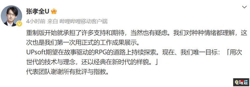 《仙剑奇侠传四重制版》制作人张孝全表示重制版开始就承担了许多支持与期待,当然也有顾虑。同时UPsoftware会通过次时代技术与理念还原经典的新时代样貌。同时回复玩家提问时,张孝全表示《仙剑奇侠传四重制版》为即时回合制,同时公开的游戏画面皆为实机画面。