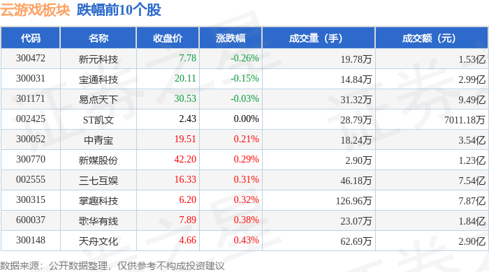 云游戏板块内个股的涨跌情况呈现出多样化的态势,具体数据已整理成表格,供投资者参考。以下是部分数据的可视化展示: