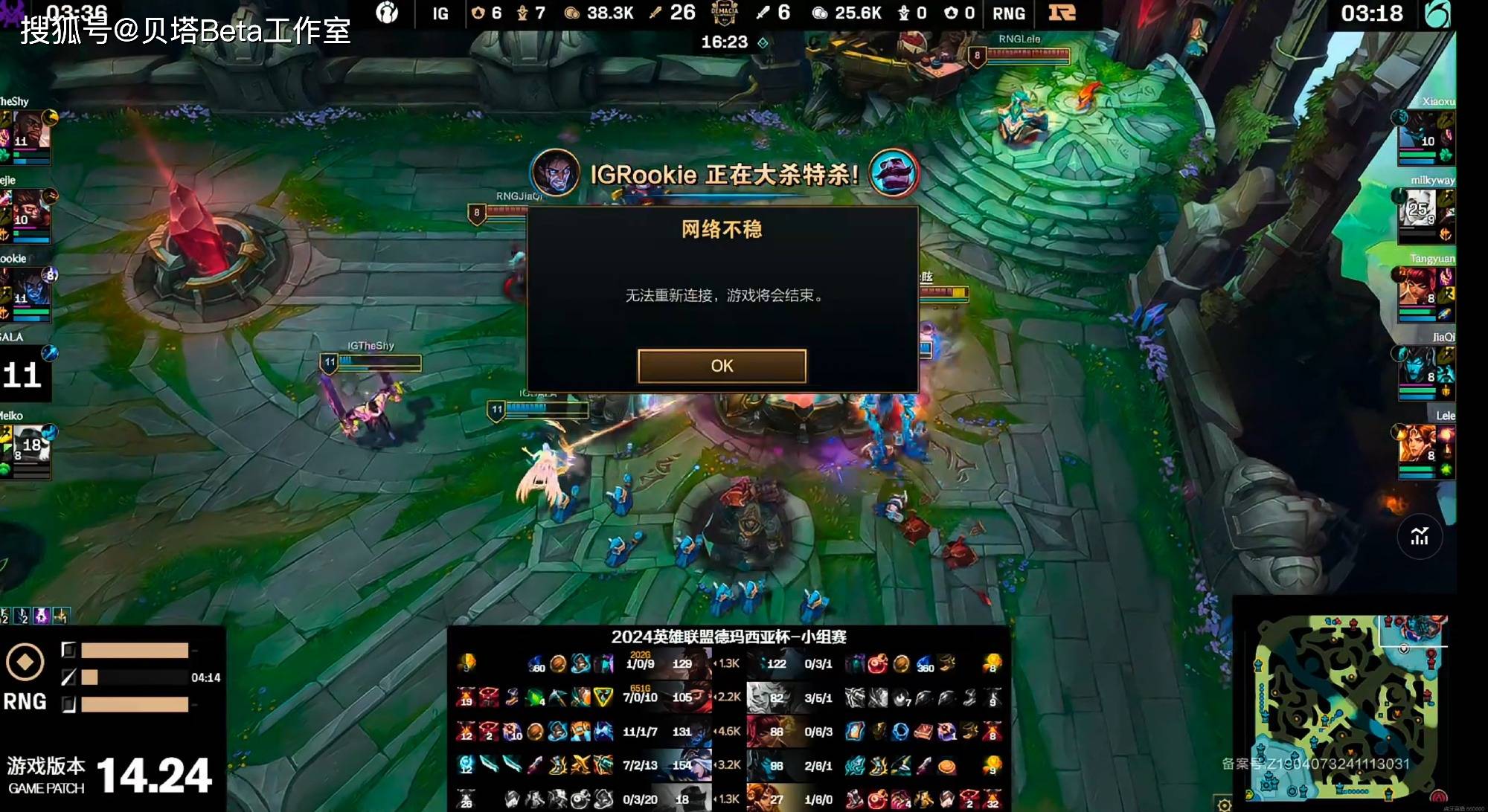 第三局RNG的对手是IG,IG派出全神班阵容。刚开局RNG就送出3个人头,之后从对线期到中期团战,RNG都是惨遭暴打虐杀,IG后面完全当表演赛在玩,各种乱打乱杀,轻松取胜,RNG则是输得耻辱。