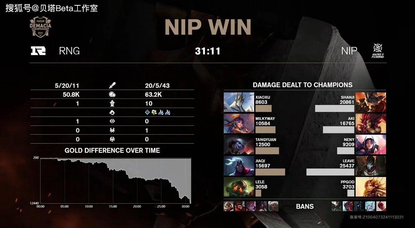 首先第一局RNG对阵NIP,对线期RNG下路炸裂,两人轮流送,山鸡兰博都单杀JiaQi韦鲁斯两次。中期汤圆小炮经典跳脸秒送人头,NIP团灭RNG后开始掌握经济优势,随后野区击杀Milkyway莉莉娅后,NIP拿下第一条大龙。最终leave烬伤害爆炸,NIP破掉三路高地后,拿下第一局的胜利。